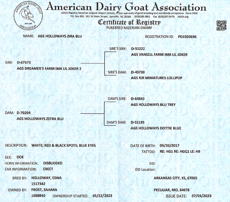 (Our entire herd is ADGA & AGS registered, only ADGA certificates are shown at this time)