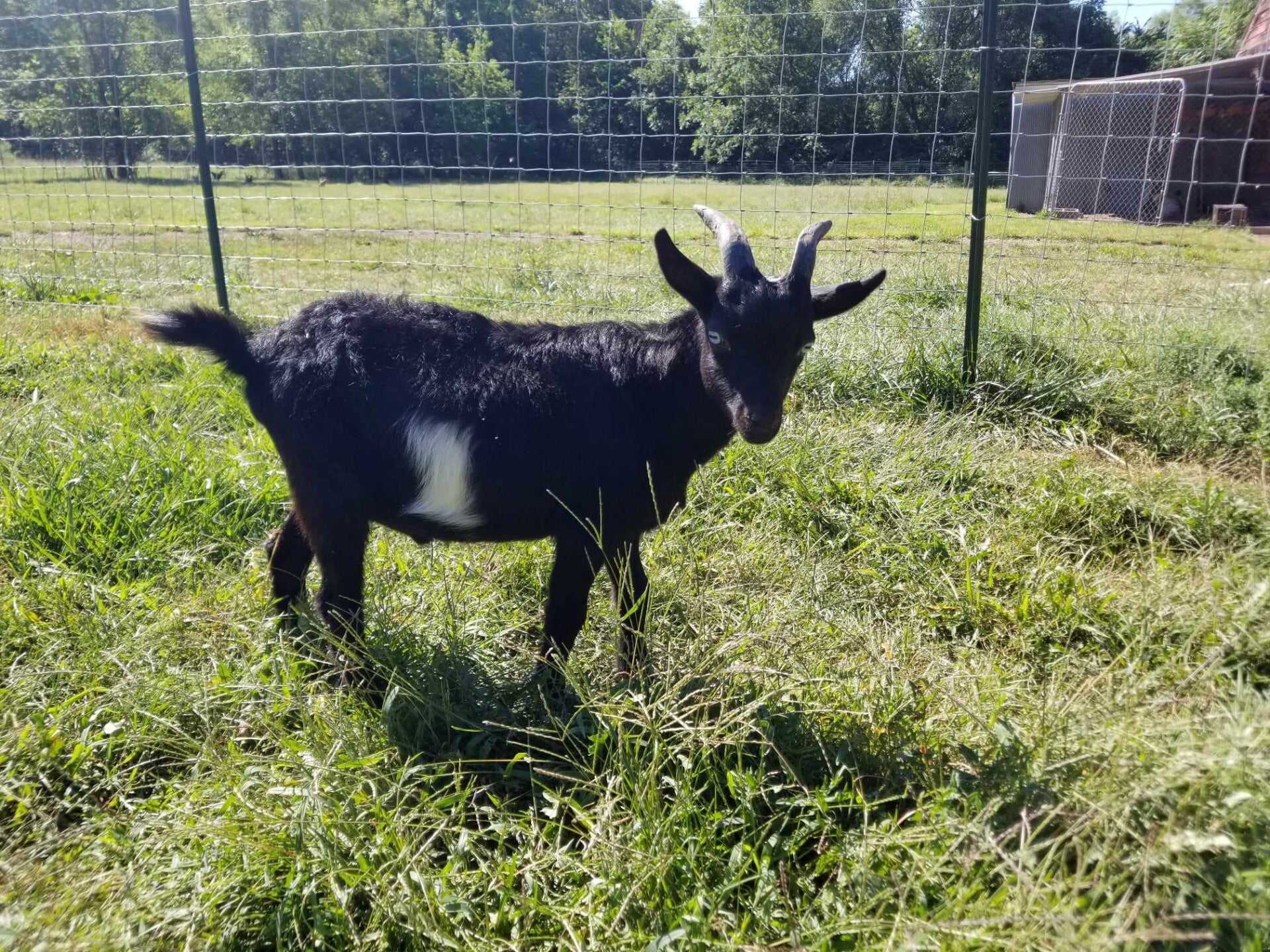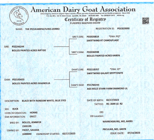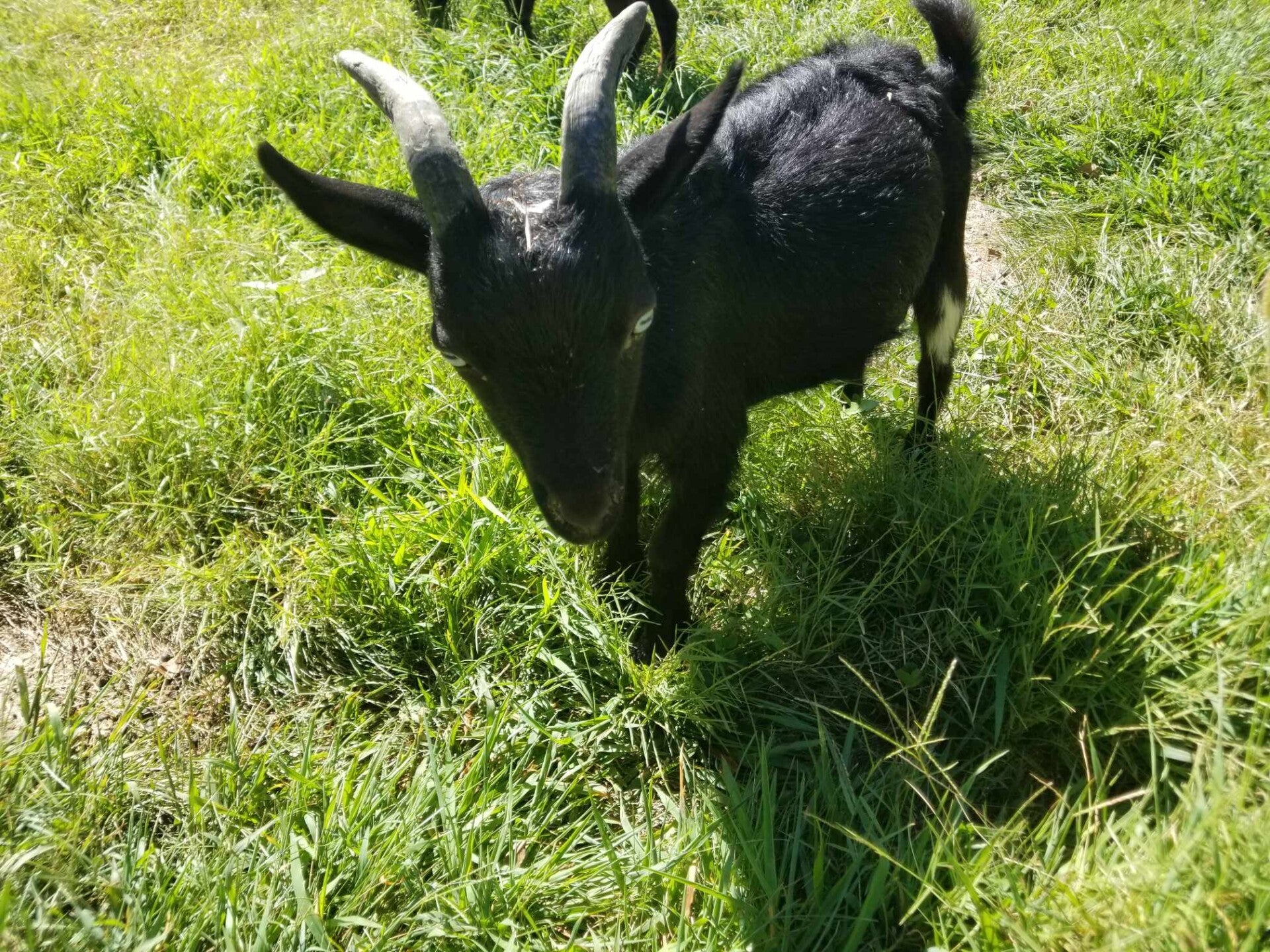 Zorro is ADGA registered. Mostly black with two small white patches, blue eyes, and horns. He is very tame and easy to handle. Has had his CDT vaccination and coccidia preventitive. Ready to breed this fall. His pedigree is Bolles painted acres and Swiftwind bloodlines.