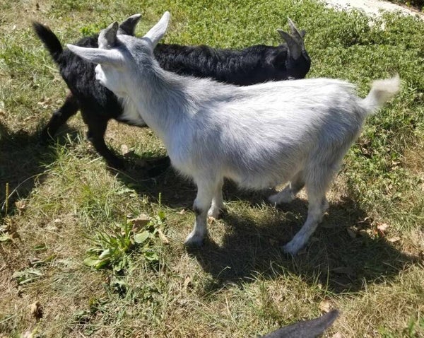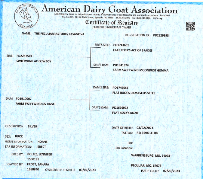 Casanova is ADGA registered. All silver, with brown eyes, and horns (his horns are rounded and a bit stunted, as we had tried to disbud him but he was too far along with his horns. He has been discounted for this). He is very tame, easy to handle and loves pets. Has had CDT vaccination and coccidia preventitive. He will be ready to breed this fall. His pedigree is Swiftwind Farms and Flatrock bloodlines.
